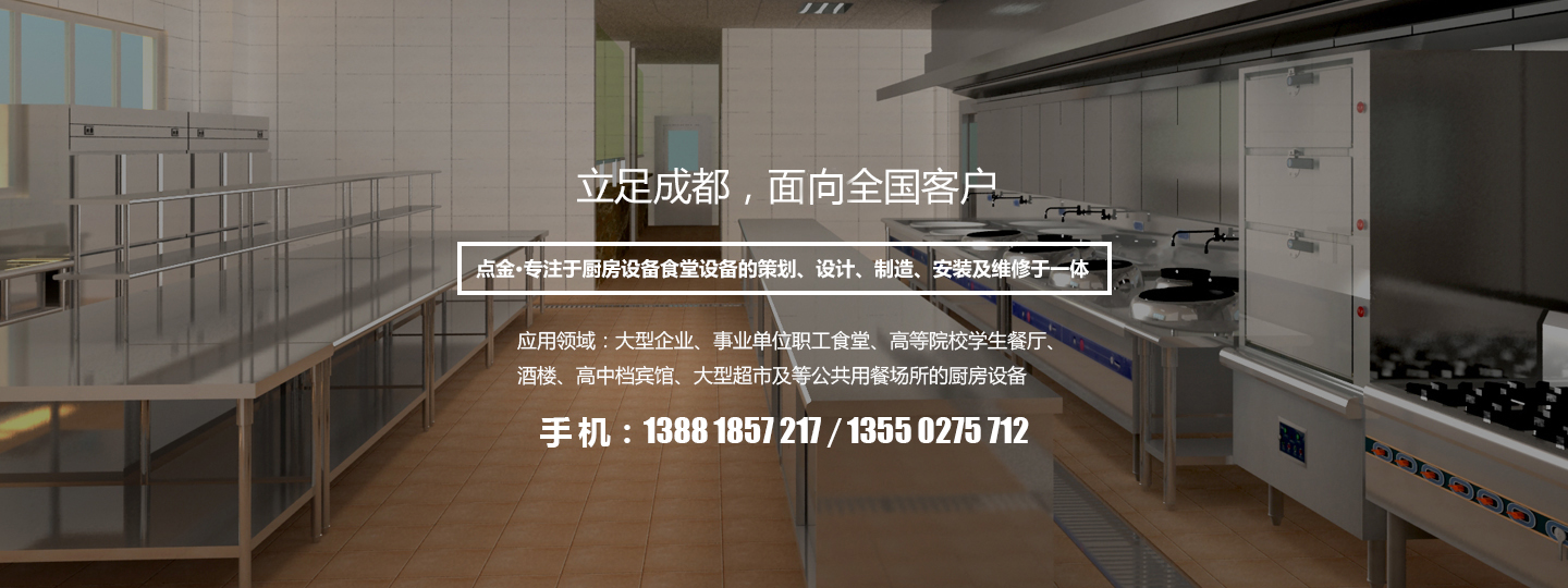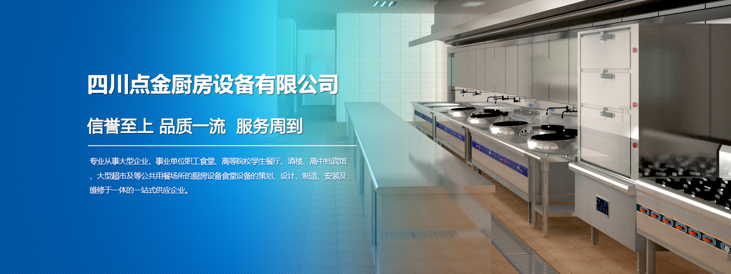 四川点金厨房设备有限公司坐落于天府之都“成都”,是专业从事大型企业、事业单位职工餐厅、高等院校学生食堂、酒楼、高中档宾馆、大型超市及等公共用餐场所的厨房设备、食堂设备、厨具的策划、设计、制造、安装及维修于一体的一站式供应企业。从生产、设计、研发到物流配、安装,再到售后保养维修,我们拥有自己专业团队。研发、采购、生产、质检,我们均贯彻精益求精的信念,以严谨认真的态度对待产品,务求赢得广大客户及各界的认同! 四川点金厨房设备有限公司主要经营厨房设备、食堂设备、厨具设备、不锈钢厨房制品、酒店